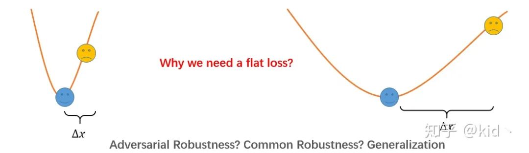 接下来是我的一些分析,首先是前面提到的灰色三角形和红色三角形两个极小值点,分别由上述两个损失代替,右边的损失比左边的损失看起来更“平坦”。我们从对抗样本的角度来理解,蓝色的笑脸代表正常被分对的样本,对抗样本是通过优化样本使得损失变大,从而让模型对该样本分错(黄色的难过脸)。直观来看,越平坦的损失会让对抗样本的生成越困难( 越大),因此越平坦的损失会让模型对对抗扰动越鲁棒。