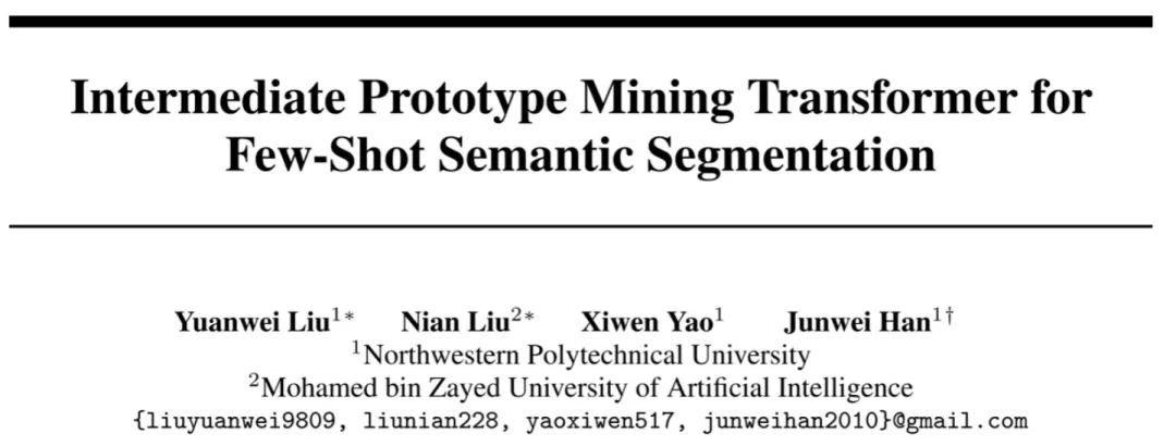 本文简要介绍发表在NeurIPS 2022上关于小样本语义分割的论文《Intermediate Prototype Mining Transformer for Few-Shot Semantic Segmentation》。该论文针对现有研究中忽视查询和支持图像之间因类内多样性而带来的类别信息的差距,而强行将支持图片的类别信息迁移到查询图片中带来的分割效率低下的问题,引入了一个中间原型,用于从支持中挖掘确定性类别信息和从查询中挖掘自适应类别知识,并因此设计了一个中间原型挖掘Transformer。