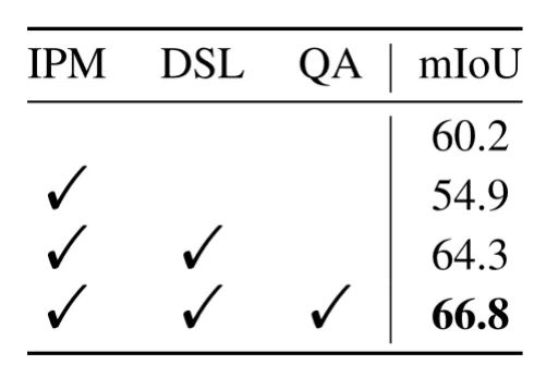 表5中指出,当仅使用 IPM 会导致 5.3 mIoU 的性能下降。然而,当添加 DSL 时,模型的性能在baseline上实现了 4.1 mIoU 的提升。作者认为这种现象是合理的,因为无法保证 IPM 中的可学习原型将在没有 DSL 的情况下学习中间类别知识。同时,使用 QA 激活查询特征图可以进一步将模型性能提高 2.5 mIoU。这些结果清楚地验证了作者提出的 QA 和 DSL 的有效性。