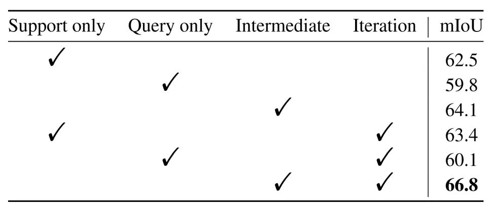 在表6中,作者对比了仅使用support或者query提供类别信息时,和是否使用迭代方式提取信息时的模型的性能情况。可以看出,借助中间原型以迭代的方式从support和query中都获取类型信息所取得的效果更为出色,也验证了作者提出方法的有效性。