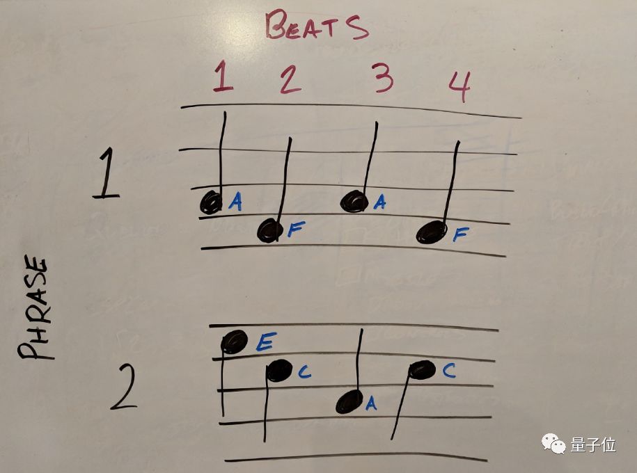 图中展示的是两个乐句,每个有4个节拍,每个音符旁边,是音符的名字,最上面是节拍。播放这些乐句的顺序,是从左到右依次进行。