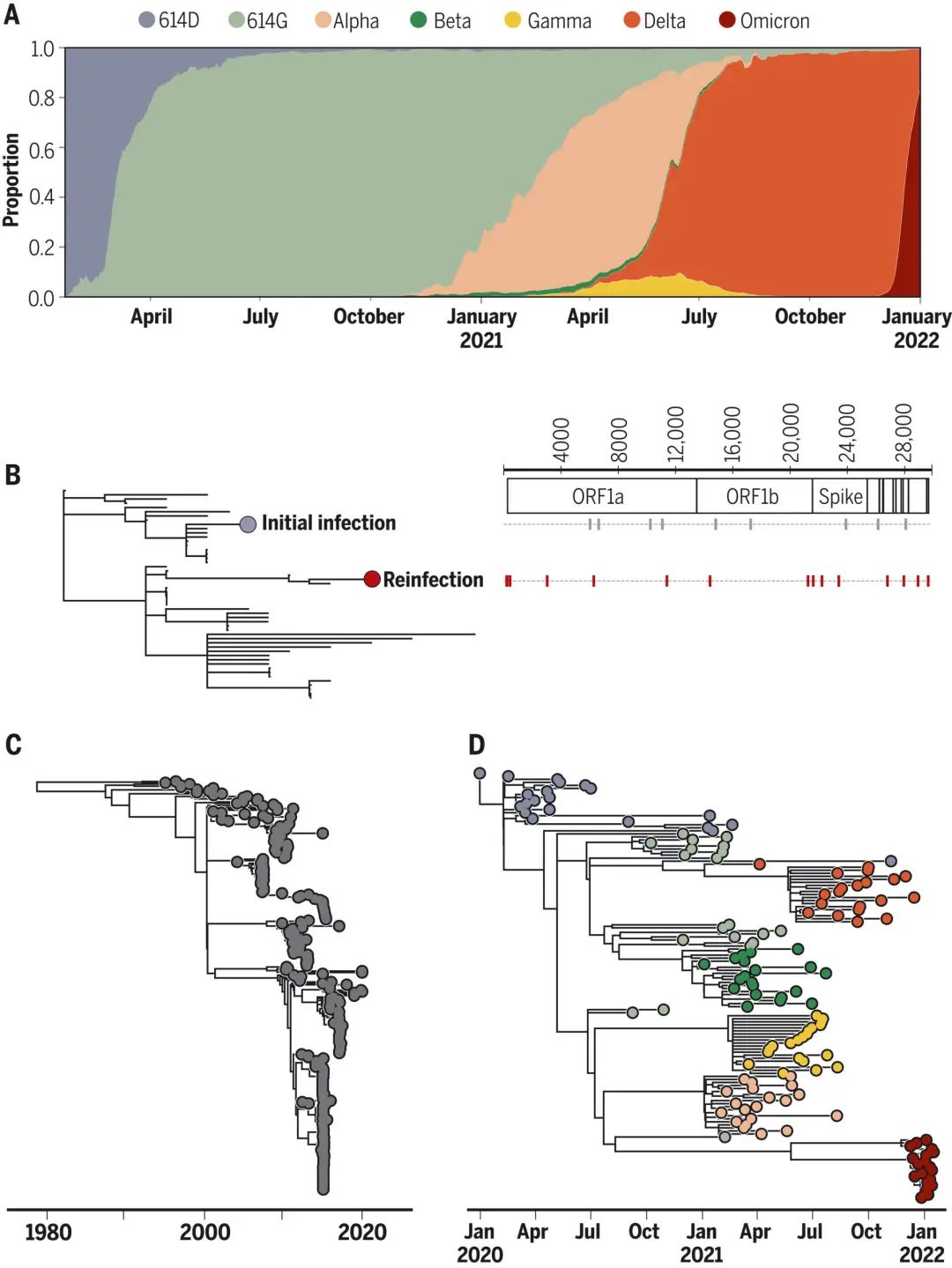 2020 年底,B.1.1.7 谱系(现在称为Alpha变体)被发现,并在英国迅速传播。该谱系所包含的一些突变显著改变了病毒表型,从而影响了传播性 。基于病毒序列数据的量化研究表明,其繁殖量是当时其他谱系的 1.5 到 2 倍。