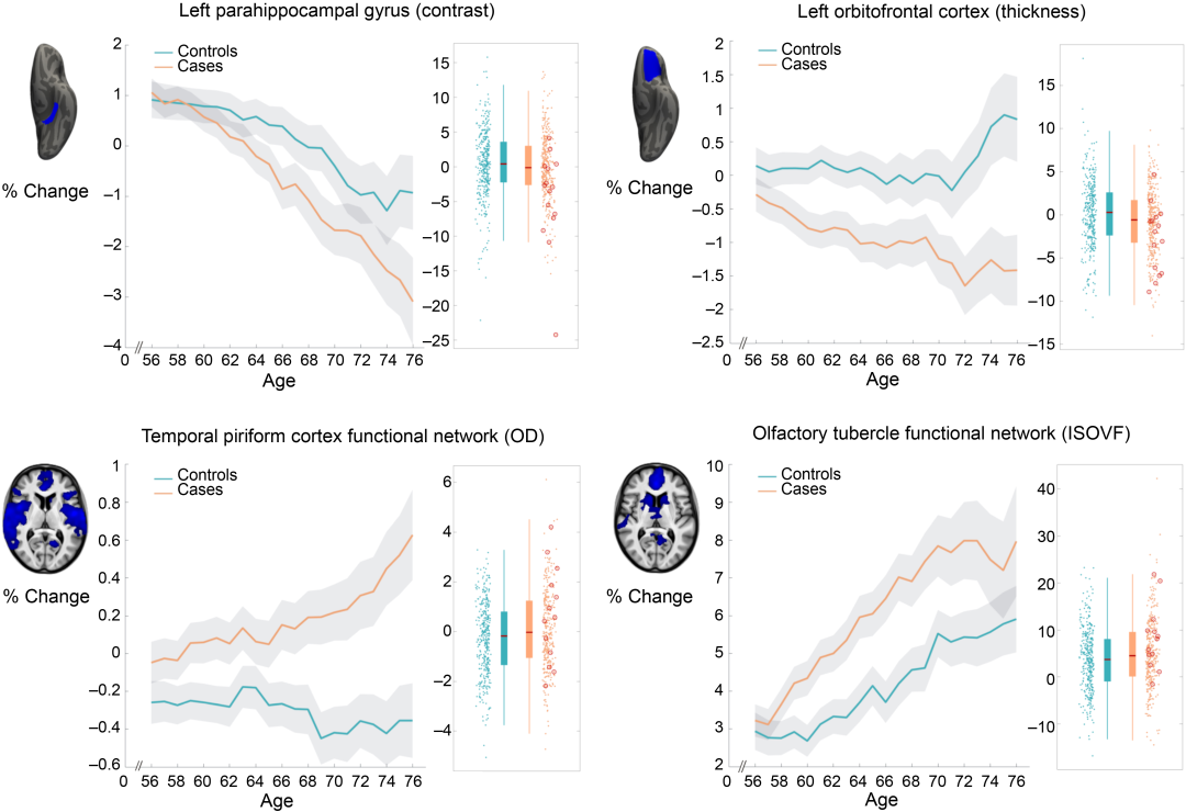 具体来说,损失的灰质主要集中在与嗅觉有关的区域,包括眶额皮层和海马旁回,而这些区域也参与了记忆和其他功能。