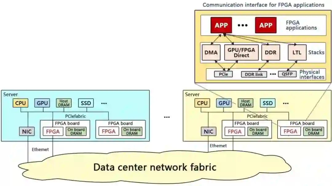 众所周知,FPGA是大型云基础设施的底层技术支撑,如今被广泛地部署在数据中心里。相比于CPU或GPU,FPGA的优势在于更高的计算效率。为了发挥FPGA的计算效率优势,则需要FPGA直接访问数据中心中的各种资源,而不是由CPU进行中转,这些资源包括大量存储,如主机内存和NVMe硬盘等等。而数据中心中的计算业务通常很庞大,单个FPGA无法装载全部的逻辑或是无法满足计算的延时需求,往往需要多个FPGA协同完成计算。同时,异构计算还需要FPGA与CPU或GPU等计算设备交换数据。
