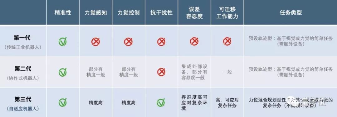 区别于一代高精度位置控制机械臂、二代协作式机械臂,第三代自适应机械臂有三大特点,让它与一代、二代机械臂有了革命性的差别: