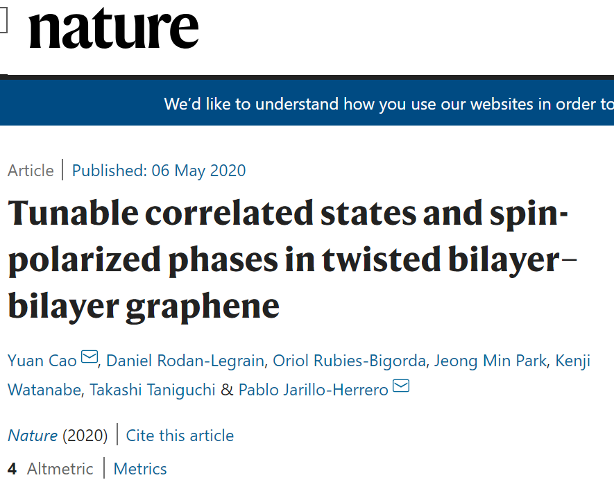 在第一篇Nature论文中,研究人员致力于通过对扭转角的控制,将魔角特性推广到其他二维研究体系,以调谐和控制电子-电子相互作用的强度,实现相似的物理行为。他们采用了一种全新的魔角石墨烯体系:基于小角度扭曲的双层-双层石墨烯(TBBG)。