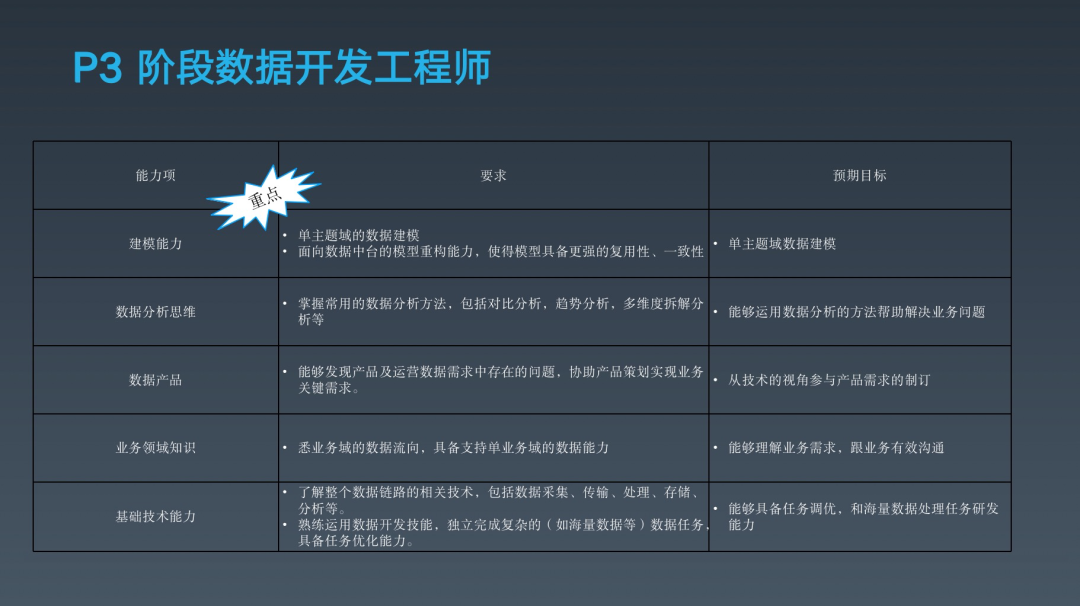 下面这是其中一位大佬梳理的大数据开发工程师某个阶段的能力模型,看看你现在处在什么阶段。