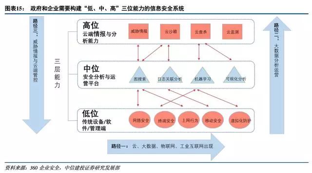 低位能力是传统的安全防御能力,包括传统的终端安全、网络安全、上网行为和移动安全等等,是数据采集层也是命令执行层,低位产品市场竞争较为激烈;中位能力是对海量数据的建模与分析能力,包括安全运营和安全分析能力;