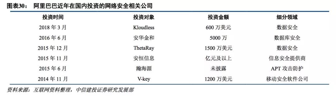 阿里云过去4年在国内外也有多次投资与并购,比较有名的投资标的包括安华金和、ThetaRay和安恒信息,同时阿里巴巴投资了以色列风投JVP,该风投投资了多家本土网络安全公司,借助阿里云庞大的用户和未来逐步爆发的混合云安全需求,阿里云生态下公司也有望获得高速增长。