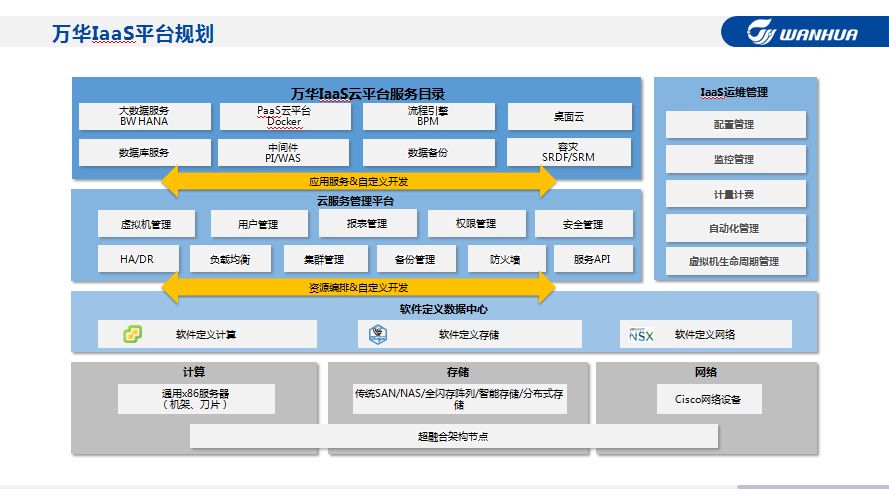 万华化学传统应用是基于SOA架构的思想和理念的,由传统的基础设施去支撑相关的中间件/数据库,公共的服务,通过服务总线去支撑上面的一系列应用系统。而众多新兴应用是基于互联网的云架构,包括底层的IaaS,中间层的PaaS,到最上端的SaaS,标准的云架构。对万华来讲,要实现相关应用支撑的话,最核心的就是PaaS平台。包括CaaS容器云平台,微服务开发平台,以及研发运维过程管理的Devops,集中监控CMP等等。基于这些,对IaaS平台提出新的要求,就是要能够灵活快速的去响应对底层资源的支持。