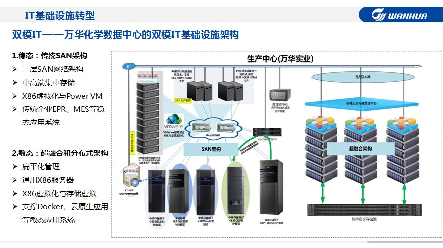 传统IT基础设施架构还是标准的三层架构:上层主要还是以服务器为主,中间是SAN存储网络,下面是存储。通过这种架构去支撑相应的传统应用,是没有太多问题的,但如果未来去支撑各种灵活的新兴应用的话,传统的架构会越来越吃力,这也是万华化学双模IT基础设施部分转型的出发点和相关思考。