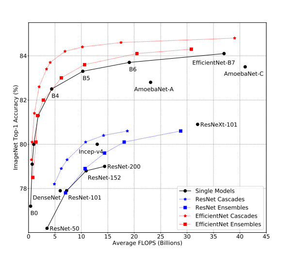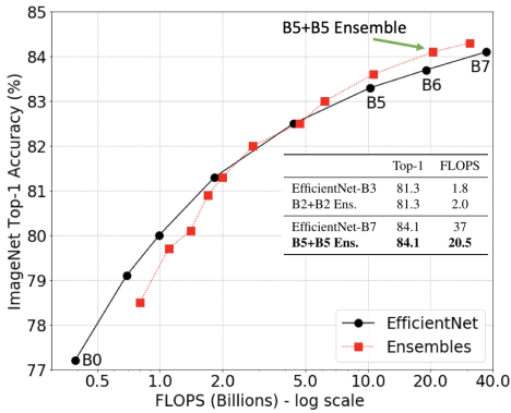 例如,两个EfficientNet-B5模型的集成可以匹配单个EfficientNet-B7模型的精度,但是使用大约50%的FLOPS。