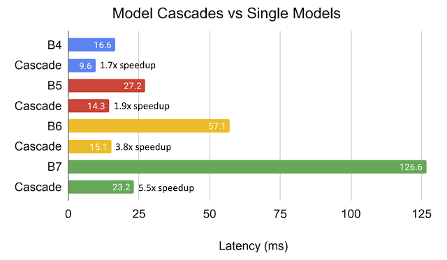为了测试这种方法,他们为EfficientNet、ResNet和MobileNetV2系列构建模型级联,以匹配计算成本或精度(将级联限制为最多四个模型)。
