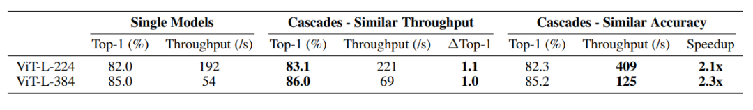 ViT模型的级联在ImageNet上的表现。级联可以以相似的吞吐量实现比ViT-L-384高1.0%的精度,或者在与其精度匹配的情况下实现比该模型高2.3倍的速度。