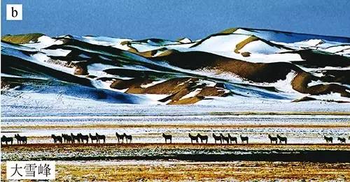可可西里地区气候寒冷,横贯本区的昆仑山、可可西里山、乌兰乌拉山和祖尔肯乌拉山超过5500m 的山峰终年冰雪覆盖(图2),发育着各种类型的现代冰川,以大陆型冰川为主。区域内雪山冰川与冻土带形成独特的冰缘地貌景观,包括冻胀丘、冻胀草丘、石冰川、热融洼地,热融湖塘、冰缘黄土与砂丘、冻胀“石林” 和融冻褶皱(冰卷泥) 等。根据2014年数据统计,可可西里发育429条冰川,其冰川面积为852.65km2,占全国冰川面积的4/5 以上,冰川储量为71.33km3。