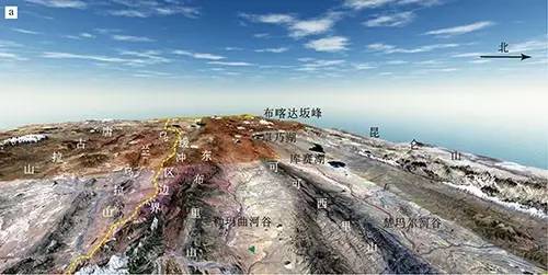 a.可可西里地区高山与宽谷三维地形图(数据来源 landsat8, http: / / glovis.usgs.gov/ ); b. 唐古拉山及沱沱河河谷;c.昆仑山及楚玛尔河河谷