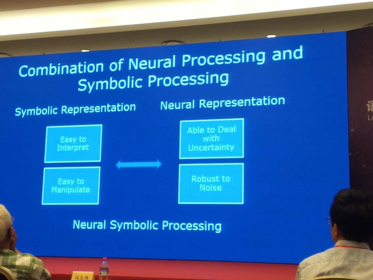 我们现在可以明显看到,符号表示和神经表示其实是互补的。大家自然会想到这样一个问题,我们能不能把这两个结合起来,这就是我们说的神经符号处理。我们希望通过这样的手段,能够把自然语言处理能做得更好,把这个技术往前推动。