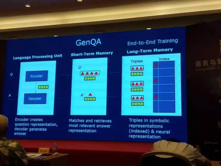 但是,我们可以想象,长期记忆里的信息和知识,都是既有符号表示又有神经表示。做问答的时候来了个问题,做了分析有了内部表示以后,可以通过在短期记忆里的表示,通过表示之间的匹配,在长期记忆里找到相关的信息和知识,在短期记忆里也产生对应的符号和神经表示。这时候还有一个解码器,把这个表示转换成自然语言、答案,这样我们就可以构建一个非常智能的自然语言问答系统。