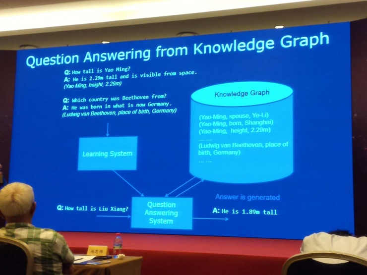 问:您刚才提到两种表示方式,一种是传统符号的表示方式,现在是知识图谱中间的一种表示,另外一种是向量化的表示。我觉得向量化的表示方式一种好处是,虽然我觉得我们有很多知识,很难用目前这种逻辑符号方式来描述,用向量化的表示方法,不一定很准,但可以从大量语料里头学习到一定的东西,我们虽然不知道它是对的。但对于传统符号很难表示的这种情况下,像您刚才说的这种,怎么来互相结合?