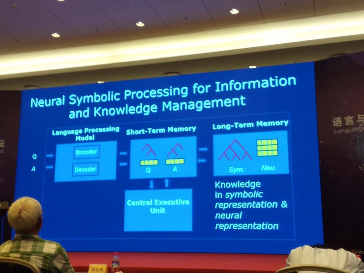 我们可以考虑用这样的技术,神经符号处理实现智能信息知识管理系统。就是说,你先来了一个问题,通过语言处理模块,它有编码器和解码器,编码器把这个问题转换成中间的表示,中间表示放在短期记忆里,这个问题是有两部分,既有符号表示又有神经表示。现在自然语言处理内,很多系统类似在做这样的事情,大家可能没有明确说这个事。