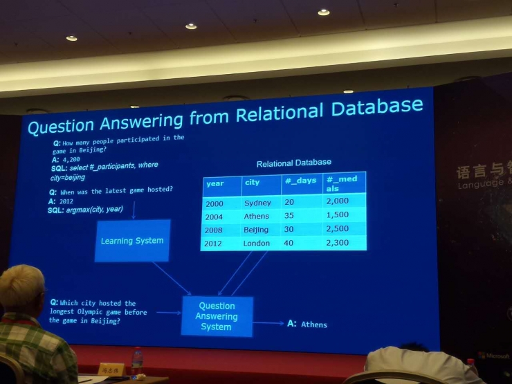 第一个是在知识图谱里面进行知识问答。假设我们有大量数据,比如说姚明身高是多少,2 米 29,我们能够有这种观点,说出答案的话,具体是对应着知识库里的哪一个单元,我们有大量数据的话,我们的目标就是有一个学习系统,就是学习神经网络的,然后构建自动问答系统。来了一个新问句的话,我们能够从数据库、知识库里面找到答案。然后就这么产生自然语言回答,这是我们现在做的一个工作。
