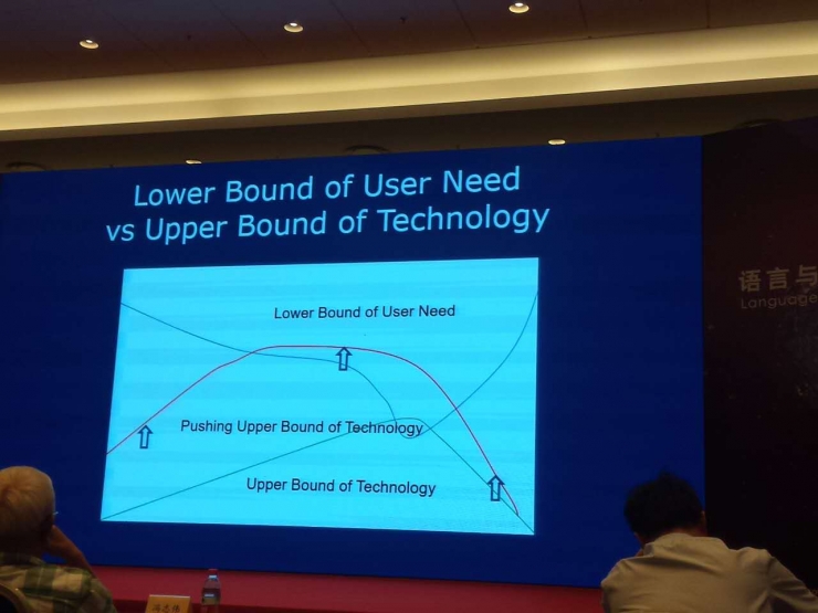 我们这个技术的上界就是,如果能够碰到需求要求的下界的话,实际上这个系统就有可能被用户用起来。大家觉得这个已经能够满足实际的需求了,否则的话,你这个做得再好,用户要求的下界更高,实际的技术也不可能实用。自然语言处理,大家现在在做的事情就是刚才看的这个绿线部分,怎么样不断往上提高,使技术的上界——红色的这部分,能够再往上提高,使得我们有更多的技术能够去满足用户需求,使得用户能够使用起来。