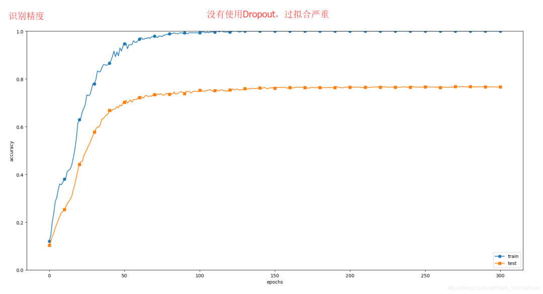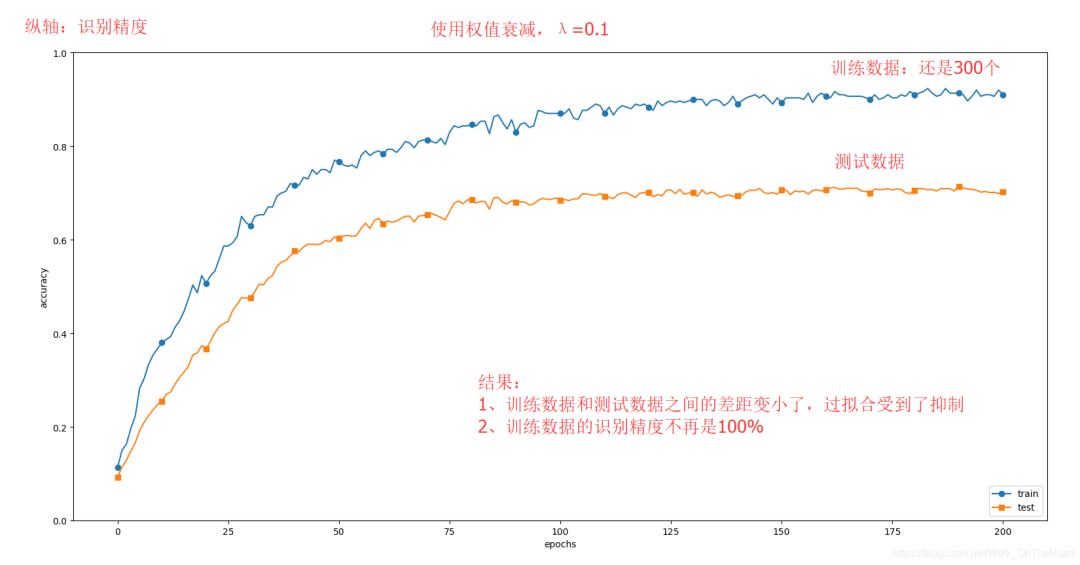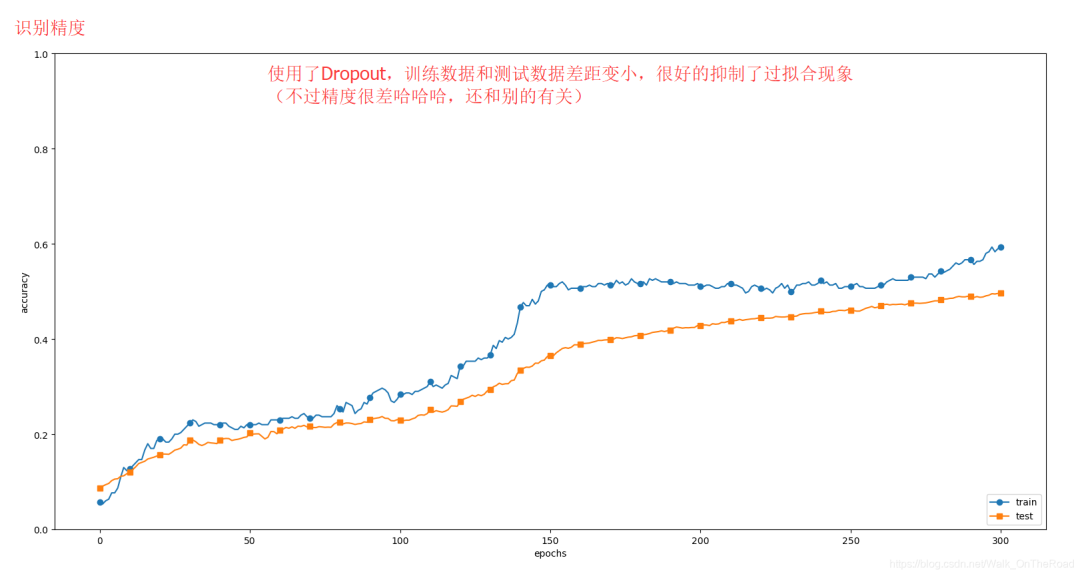 通过使用Dropout,训练数据和测试数据的识别精度的差距变小了。