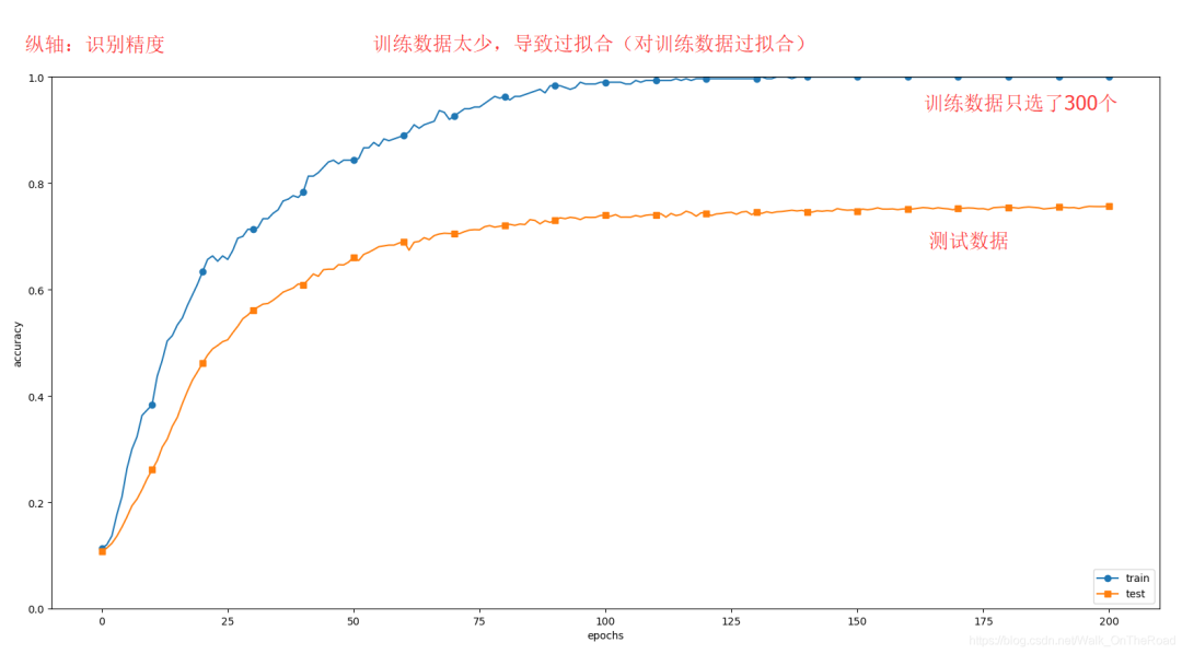 其实还可以通过改进其它超参数的值来抑制过拟合,而且能使网络的识别精度表现更好,继续看 <五、超参数的验证>