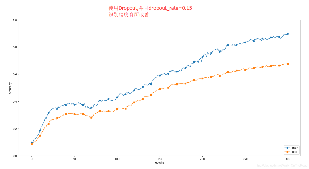 下图为使用Dropout的网络,虽然有效抑制了过拟合,但是识别精度不是很高,这还和别的超参数的设置有关;比如下图dropout_rate=0.2;我再把dropout_rate=0.15做了一次实验。可以看到识别精度有较大改善。(图二)