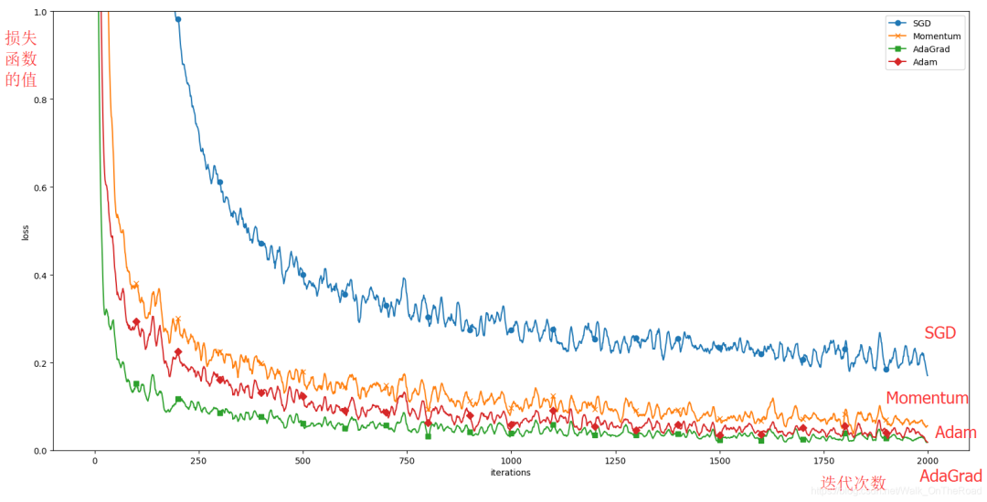 很多研究中至今仍在使用SGD。最近,很多研究人员都喜欢用Adam。本书将主要使用SGD或者Adam。