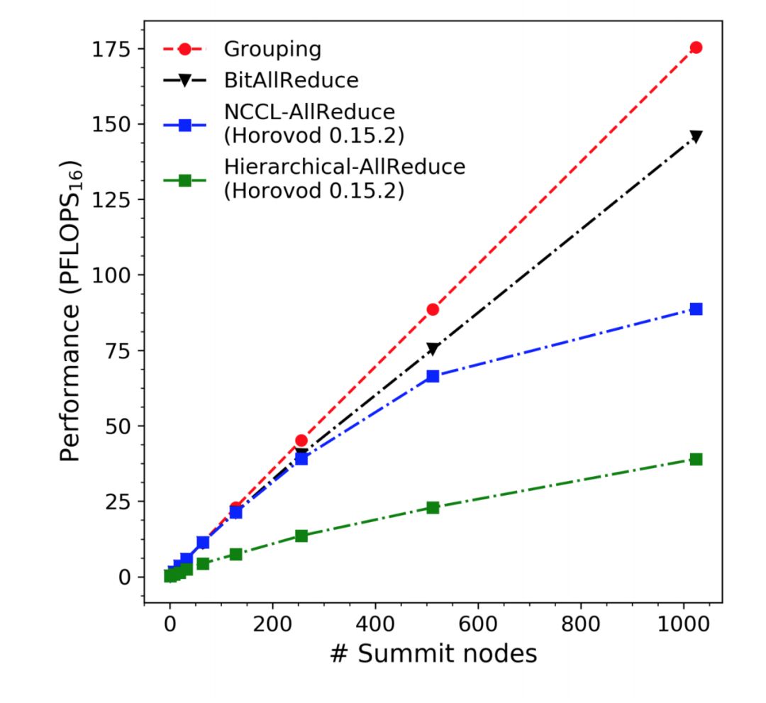 分布式计算确实需要在很多 GPU 上训练,但你见过在排名第一的超算上训练深度模型,在 2.76 万块 V100 GPU 训练模型的方法吗?重要的是,通过新的通信策略,这么多 GPU 还能实现近线性的加速比,橡树岭国家实验室和英伟达等机构的这项研究真的 Amazing。