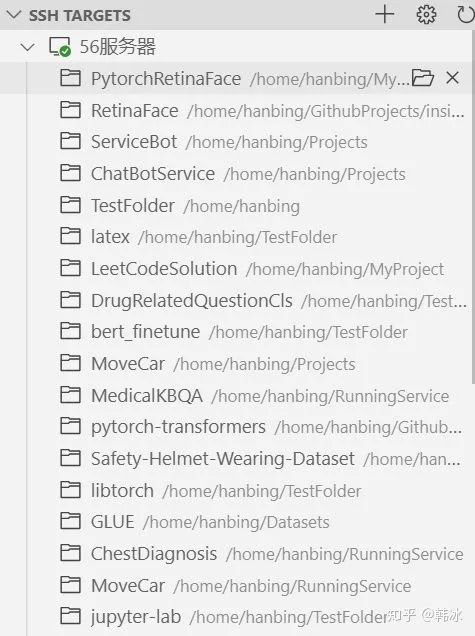图示的图标说明插件已经在远程安装。此时你便可以打开远程的任何文件夹进行项目开发,所有的编辑修改,运行代码也都会在远程进行执行。体验过之后就会感觉超级方便。妈妈再也不用担心我同步文件,切换开发机了。同时,vscode还会非常贴心地为我们记录曾经打开过的文件夹,我们可以直接点击,连接服务器打开文件夹一步到位。