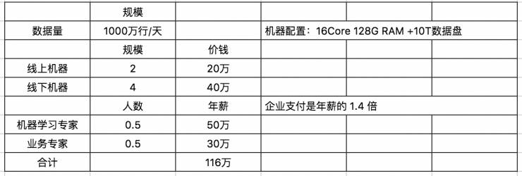 1000 万行/天的数据规模,机器学习系统一年的支出是 944 万。