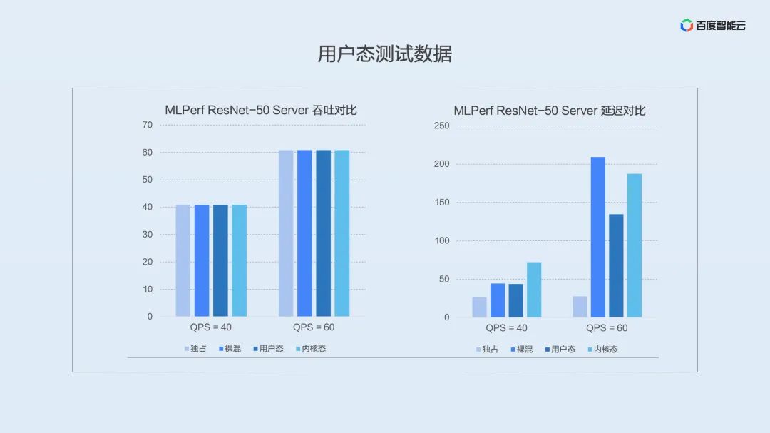 下图是我们在公开测试集 MLPerf 上选择典型模型 ResNet-50 Server 场景下的数据对比。图中的柱子从左至右依次表示独占、裸混、用户态隔离、内核态隔离下的性能。