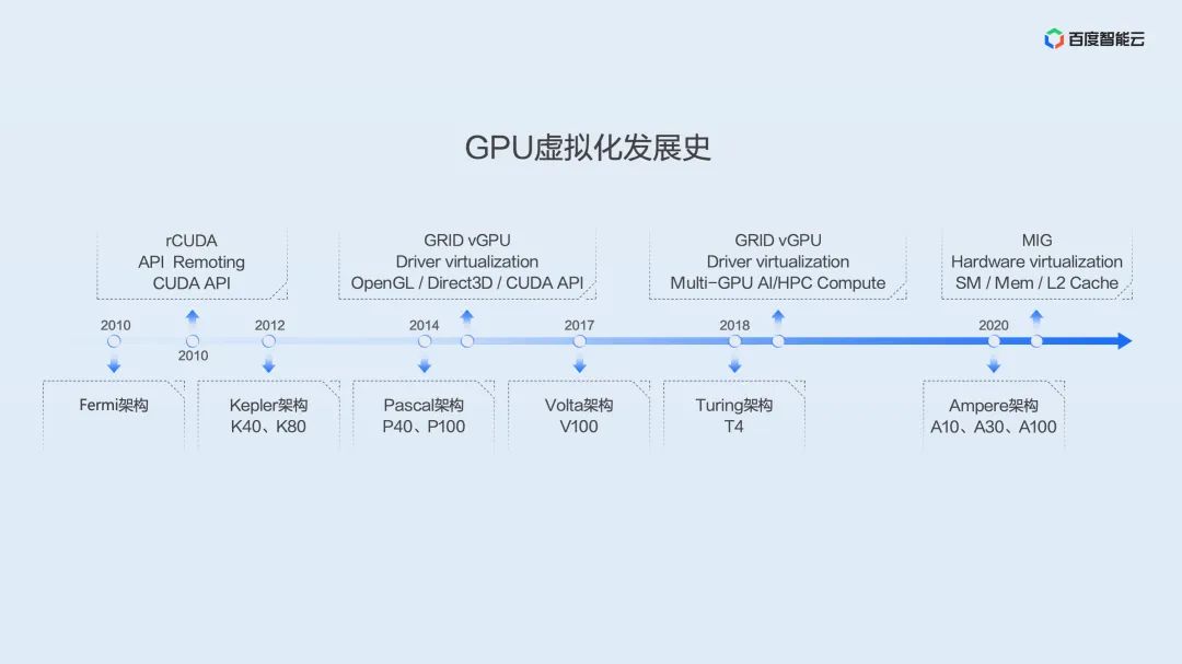 随后的 Pascal 架构、Volta 架构、Turing 架构性能有了飞速提升,这时虚拟化的需求日益显著起来。我们看到,最早从 Kepler 架构,NV 官方提供了 GRID vGPU 虚拟化方案,最开始主要是面向图形渲染和远程桌面场景。在 2019 年前后,针对 AI 和高性能计算场景也提供了解决方案。但这些方案都是基于虚机的,在 AI 场景中很少使用。