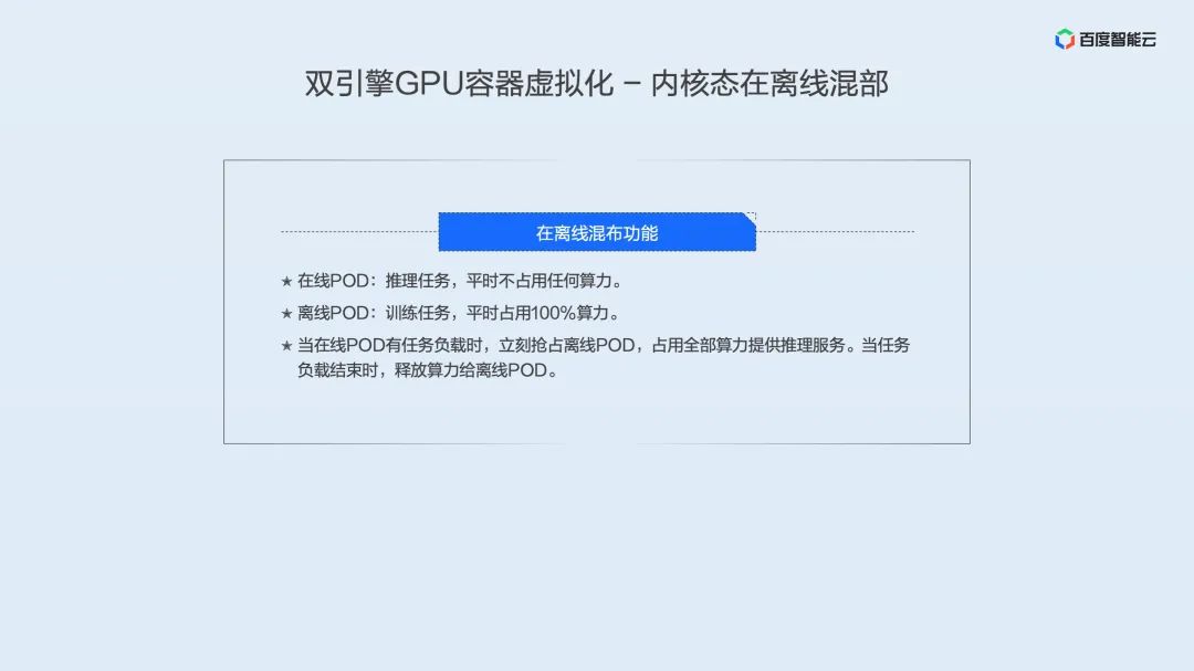 。我们特别开发了在离线混部技术,通过在线业务和离线业务进行混部,大大提高在线业务的响应速度的同时,也能让离线业务共享 GPU 的算力资源,达到提高 GPU 资源使用率的目标。我们在离线混部的特点是: