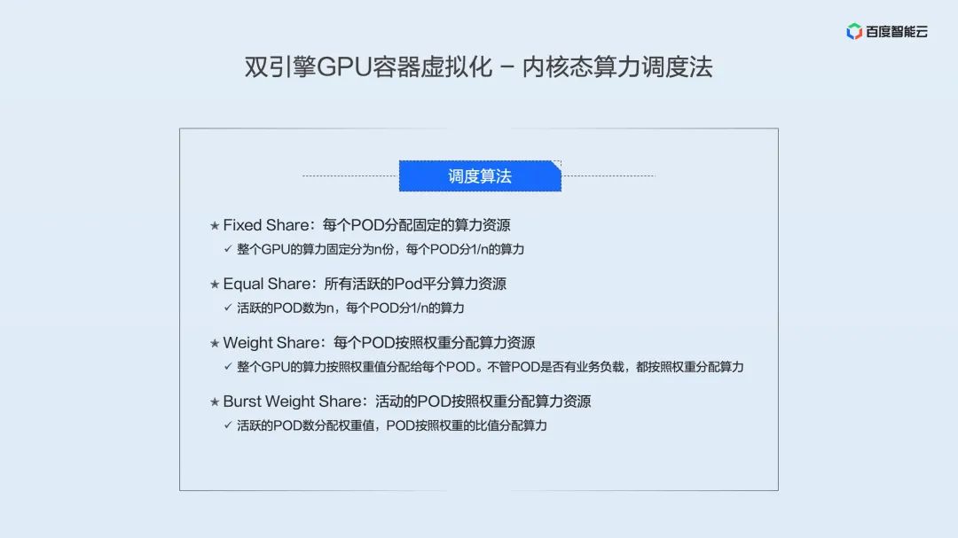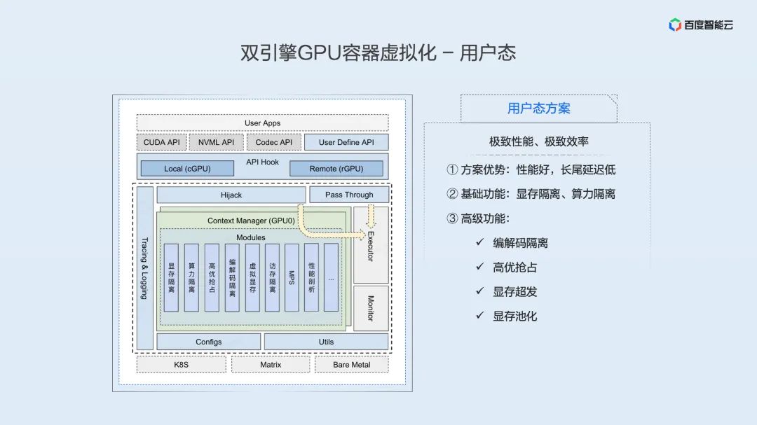 这张图展示了百度智能云 —— 双引擎 GPU 容器虚拟化架构。