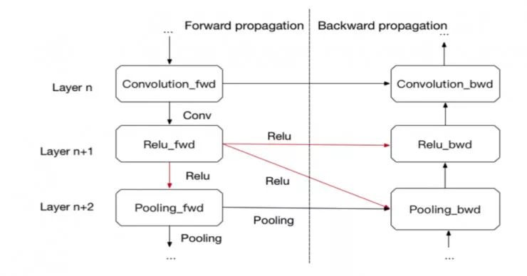 对于深度学习模型,特征图是一个层在前向传输中生成的中间输出结果,且在后向传输的梯度计算中作为输入。图 1 是 ResNet-50 在 ImageNet 数据集上进行一次小批量训练迭代的 GPU 显存占用曲线。随着特征图的不断累积,曲线到达最高点。特征图的大小通常由批尺寸(batch size)和模型架构决定(如 CNN 架构的卷积步幅大小、输出通道数量;RNN 架构的门数量、时间步长和隐层大小)。不再需要作为输入的特征图占用的显存将会被释放,导致图 1 中显存占用曲线的下降。对于复杂的模型训练,用户必须通过调整批尺寸,甚至重新设计模型架构来避免「内存不足」的问题。尽管在分布式训练的情况下,训练任务可以分配到多个设备上来缓解内存不足的问题,但是这也导致了额外的通信开销。设备的带宽限制也可能显著拖慢训练过程。