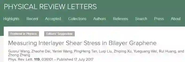 近日,中国科学院国家纳米科学中心纳米系统与多级次制造重点实验室研究员张忠、刘璐琪和清华大学教授徐志平合作,设计和发展了微纳鼓泡力学实验技术,精确表征了双层石墨烯层间的范德华剪切作用,相关研究成果Measuring Interlayer Shear Stress in Bilayer Graphene(《测试双层石墨烯层间剪切阻力》)发表在《物理评论快报》,并作为当期的主编推荐论文(Editors' Suggestion)。该工作同时被作为焦点故事(Focus Story)在[Physics 10 (2017) 81]以《石墨烯在石墨烯上滑动》(Graphene Sliding on Graphene)为题报道,认为这项研究通过鼓泡方法首次测量了石墨烯层间剪切力,获得了石墨烯器件的一个重要参量 (Creating a bulge in a graphene sheet offers the first measurement of the shear forces between graphene layers, an essential factor in many graphene-based devices)。该研究工作得到了国家基础研究计划纳米重大研发计划、国家杰出青年科学基金等的支持。