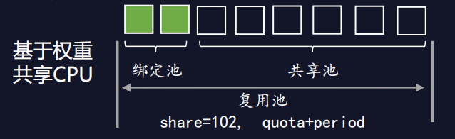 基于权重的共享CPU管理方式让离线应用可以复用所有空闲资源,同时调低离线任务的权重来降低对在线CPU资源的抢占,并采用quota与period结合的形式来限制离线业务对资源的使用。
