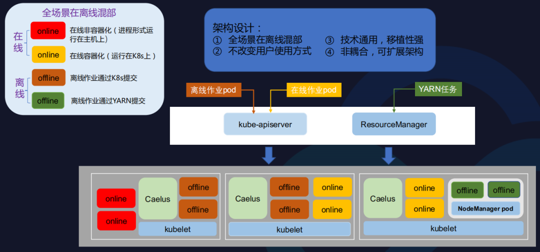 上图展示了Caelus全场景在离线混部。在线容器化已成为一种趋势,然而我们也要看到当前还有很多在线作业未容器化,这些在线作业可能还未来得及容器化,或不适合容器化。Caelus通过支持非容器化在线作业,可以打破混部在很多公司场景的限制。大数据任务是非常适合混部的,然而当前很多的大数据任务还是处于Hadoop生态,所占比例也非常高,针对这部分离线任务,Caelus也是要支持的。