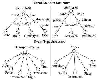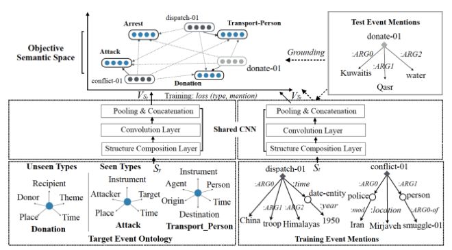 具体来说:对于新的语料,可以用AMR得到具体事件mention的结构,同时提供已定义好的关于事件类型ontology的结构。如上图所示,是对上述E1进行处理后得到mention的结构和一些已定义好的ontology结构。可以看到,事件触发词和事件类型名通常有一些共享含义,同时,两者的结构也趋于相似。本文基于这两点,将mention和ontology的结构表示联合映射到同一语义空间,最小化mention和对应的ontology的语义距离,从而学习一个通用映射函数,将已有样本训练得到的模型迁移到没有样本的事件中,整体框架如下: