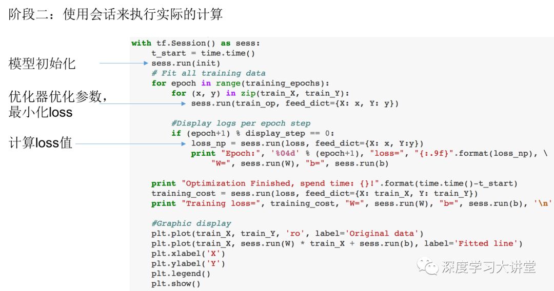所有我们想要进行的计算都需要在阶段一进行表达,如我们需要进行模型初始化这样一个计算过程,那么我们需要在阶段一构造一个init操作节点,我们需要最小化loss,更新模型参数,我们可以构造一个train_op操作节点,每个计算对应计算图中的一个计算节点,一旦计算图构建完成,我们就可以在阶段二过程通过运行这个节点来进行实际的计算如sess.run(init),sess.run(train_op)。由此通过阶段一阶段二两部分程序完成我们想要的计算逻辑,学习到的线性模型如下图所示。