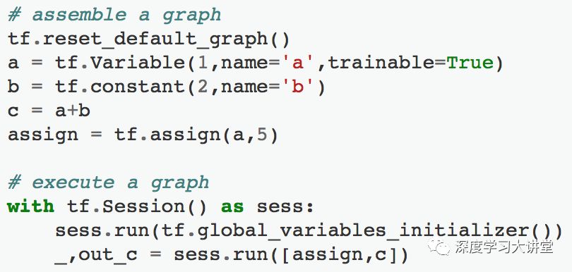 阶段一:组装一个计算图,这里只是用TF的api来表达计算模型,生成的是一个静态图,图由计算的节点以及节点之间的连接表示,这个阶段只是静态的表示了计算,因此得不到任何实际的计算值。
