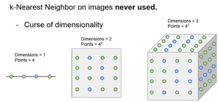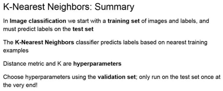 通过使用不同的距离度量,可以将 K-最近邻分类器泛化到许多不同的数据类型上,而不仅仅是向量,不仅仅是图像。例如,假设想对文本进行分类,那么只需要用 KNN 指定一个距离函数,这个函数可以测量两段话或者两段话之间的距离。因此,简单的通过指定不同的距离度量,便可以很好地将这个算法应用在基本上任何类型的数据上。