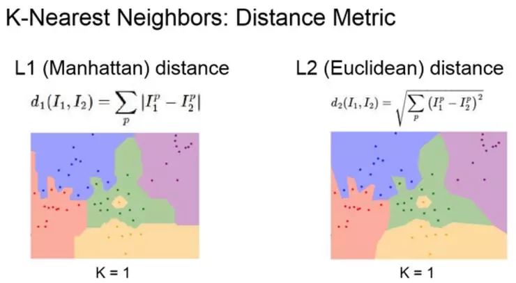 在左边可以看到一组 L1 距离,右侧是使用 L2 距离。