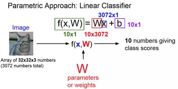 参数模型实际上有两个不同的部分,以这张图片为例子,一组是左边的猫,还有一组是权重参数,通常叫做 W,有时也叫做 θ。现在要写一些包含了输入数据 x 和参数 θ 的函数,就会输出 10 个数字对应 CIFAR-10 中对应的 10 个类别所对应的分数。根据上述描述,比如说猫的分数更大,表面输入 x 是猫的可能性更大。