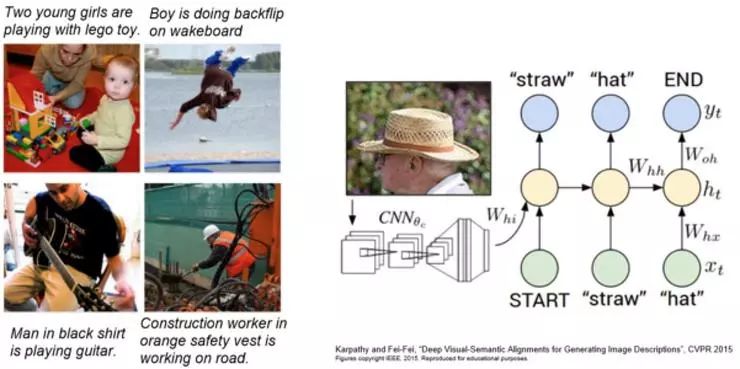 输入一副图片,然后输出用于描述图像的描述性的句子。这类工作是由一个关注图像的卷积神经网络和一个只关注语言的循环神经网络组成的,把这两个网络放在一起训练最后得到一个超级厉害的系统来做一些伟大的事情。