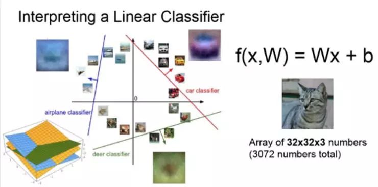 回归到图像,作为点和高纬空间的概念,可以想象成每一张图像都是高维空间中一个点,现在这个分类器在这些线性决策边界上尝试画一个线性分类面来划分一个类别和剩余其他类别。在左上角,看到用来训练的飞机样例,通过训练,这个分类器会尝试绘制这条蓝色直线用以划分飞机与其他类别。