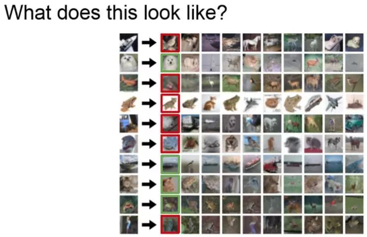 可以看到,它实际上表现的不是很好。这里标记了红色和绿色,图像分类正确与否取决于它的最近邻值,可以看到 KNN 的表现效果不是很好,但如果使用一个更大的 K 值,那么投票操作的结果就可能会达到前三名或者前五名,甚至包括所有的数据范围。